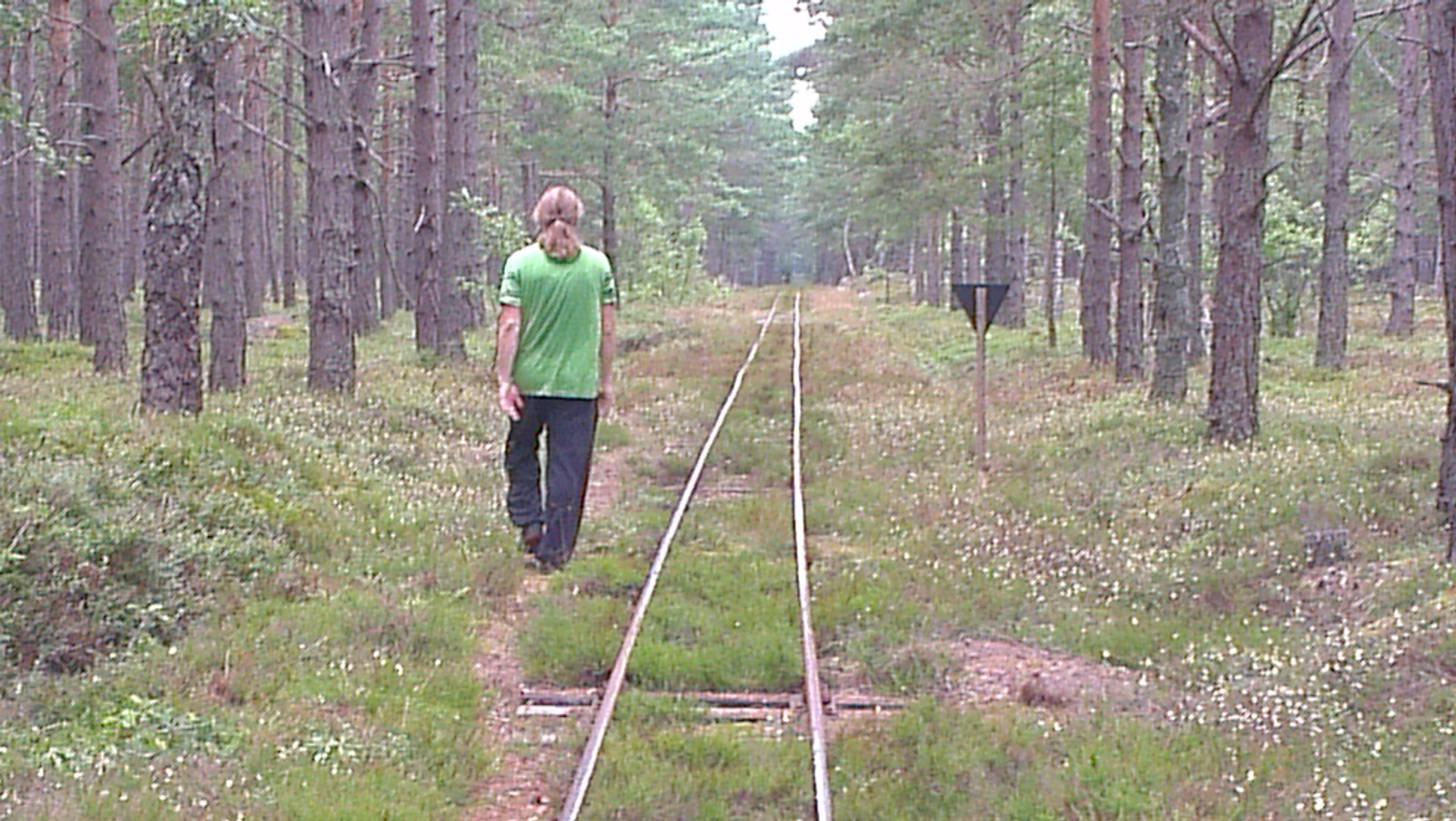 Några gånger går vi vilse, så leden tar längre tid än beräknat. När vi plötsligt får syn på en gammal tågräls, och ser på kartan att vi kan gena hem till campingplatsen – fattar vi beslutet att vandra på rälsen istället för att leta igenvuxna stigar. Efter ett tag märker jag att jag slutar se mig omkring. Till att börja med känns det skönt att slippa leta efter nya stigar. Sedan kryper sig en malande otålighet på. Är vi inte framme snart?
