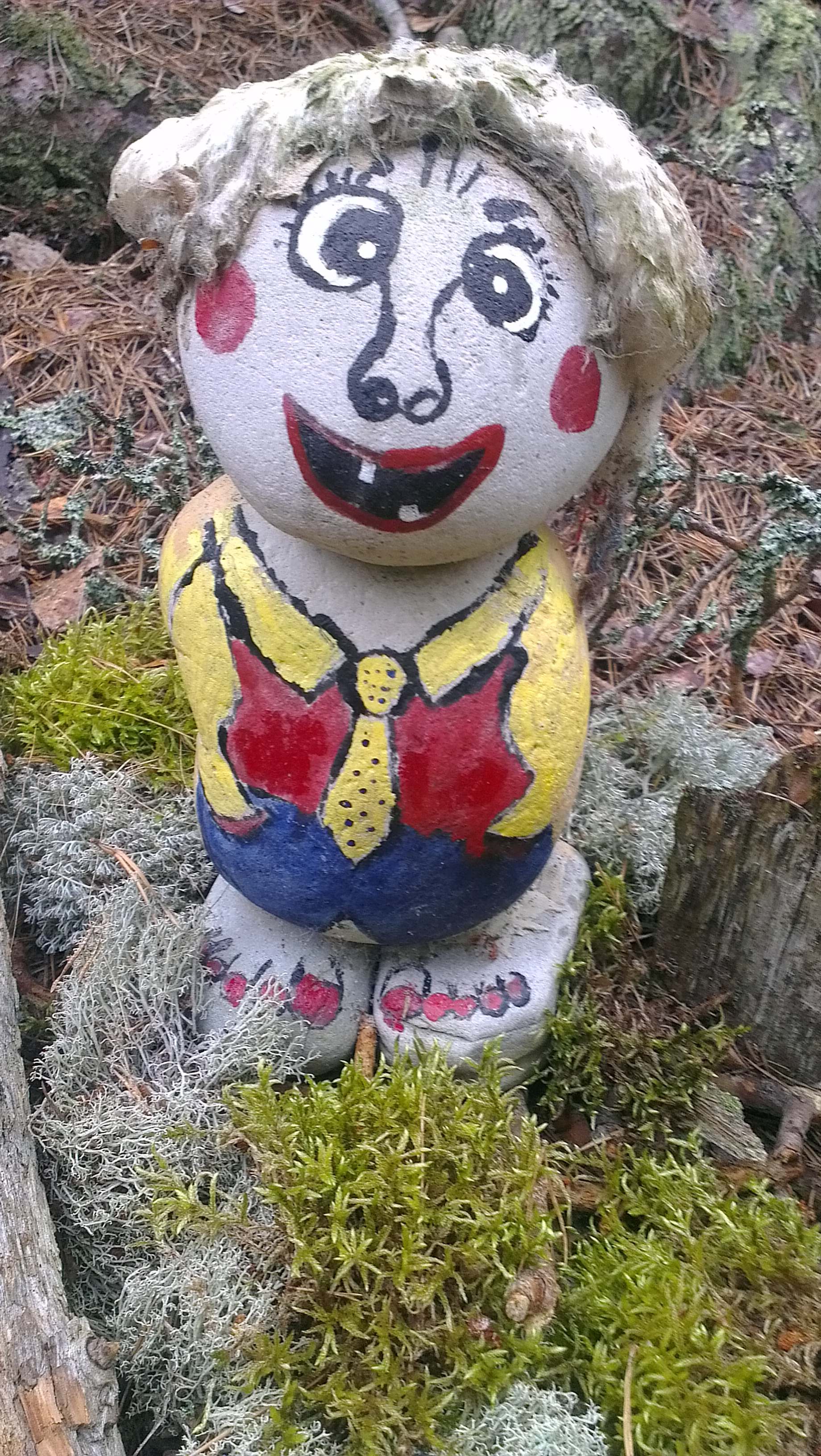 Han uppmanar mig att sluta stirra rakt fram, och titta åt sidan istället. Och då får jag syn på trollen (se foton). Mitt inne i ingenstans har någon målat, och satt ut små söta stentroll.